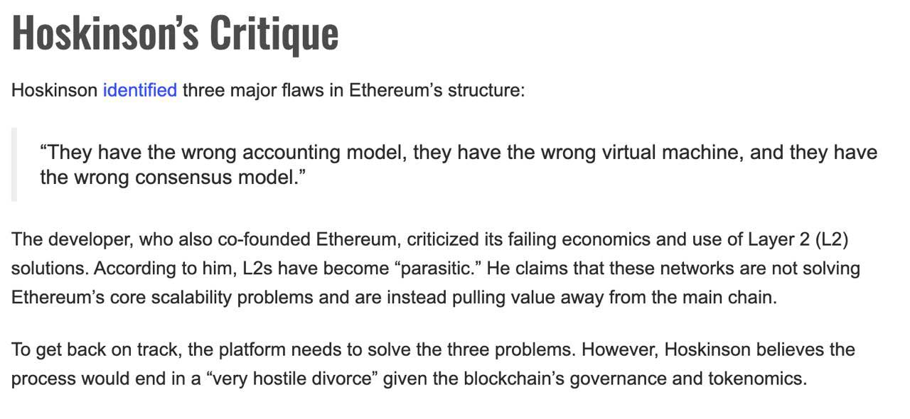 Толпа, как обычно, хоронит Эфир и все его L2-решения. Крутые ребята тоже не остались в стороне. Например, Чарльз Хоскинсон, основатель Cardano (ADA), считает, что Ethereum может не пережить следующие 10–15 лет.